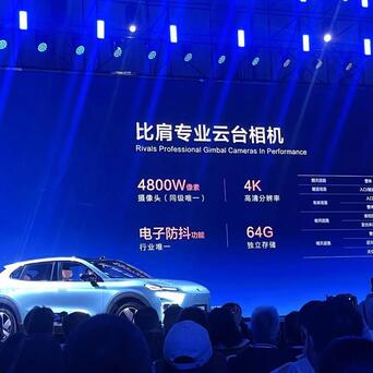 另外深蓝S05还有一个非常有趣的功能,叫车载云台相机。车顶中央有一个180度旋转的云台相机,4800万像素,路上的风景或者是好玩的人和车,他都能快捷的进行拍照和录像,再也不用在路上掏手机,方便快捷又安全。