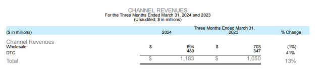 分渠道来看,品牌直运营渠道(DTC)增长41%,各区域DTC实现两位数增长,批发收入同比下降1%。